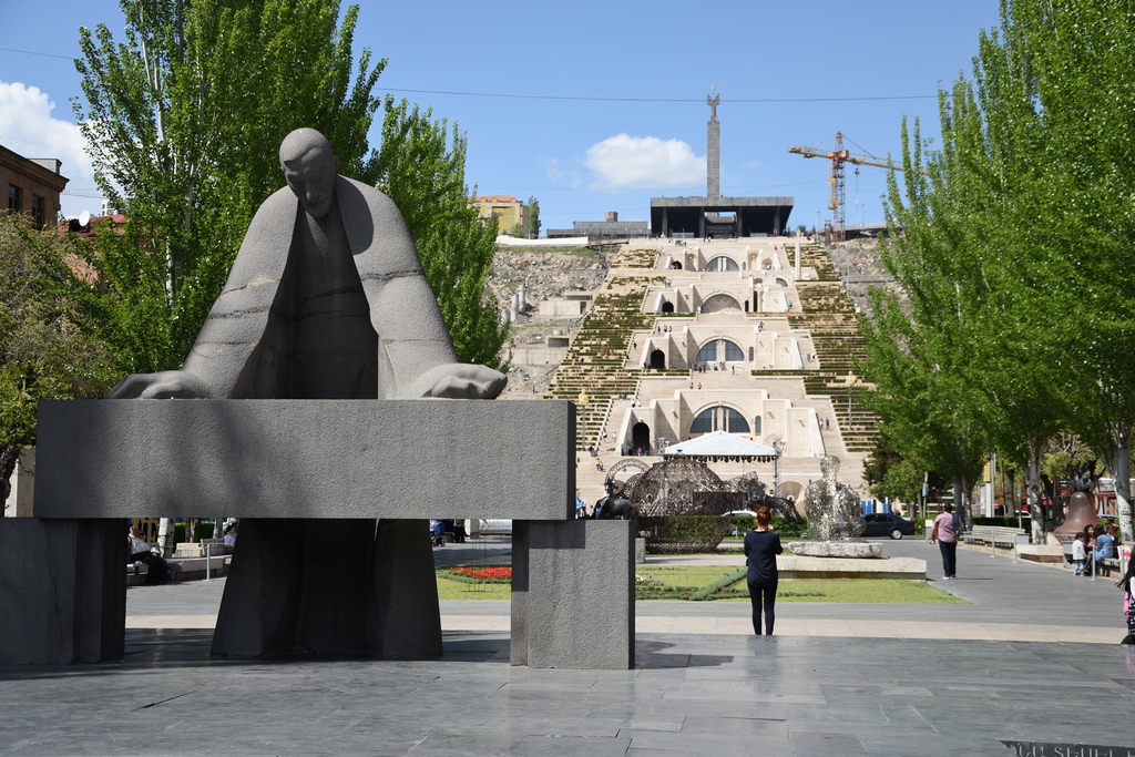 през площада на републиката. Сградата вляво е парламента на Армения.Пресякохме целия център, за да стигнем до водната каскада. Паметникът пред нея е на бивш главен архитект на Ереван, който има най-голяма заслуга за съвременния вид на града и неговото планиране.